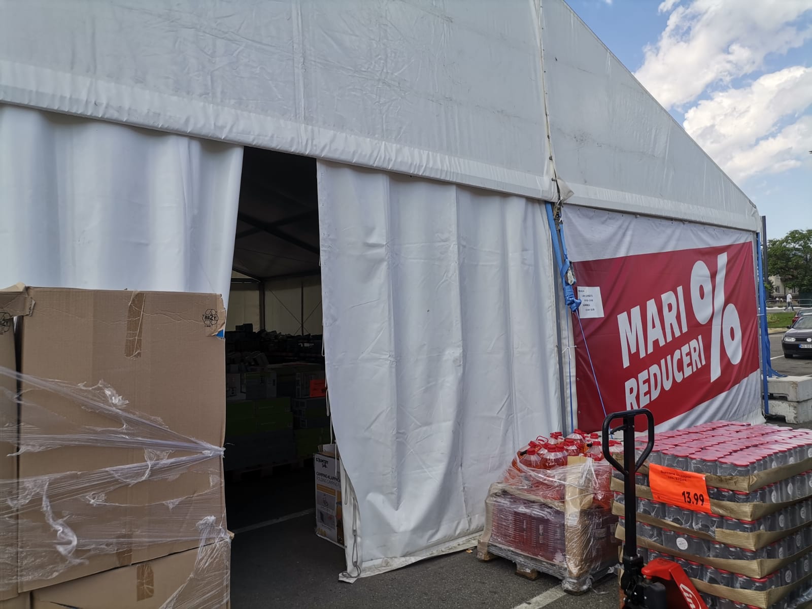 A apărut cortul cu cele mai mari reduceri. Merită să dați o tură. În parcarea Kaufland din Câmpulung, retailerul german a ridicat un cort în care se vând produse la prețuri reduse.