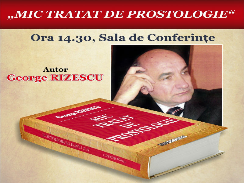 Joi, 29 octombrie 2015, de la ora 14.30, Biblioteca Județeană ″Dinicu Golescu″ Argeș vă invită la evenimentul de lansare a cărții „Mic tratat de prostologie” (Editura Tipo Moldova, Iași, 2015), autor George Rizescu. „Într-o lume atât de complicată și ciudată, într-o lume a mizeriei morale în care cu greu mai știm cine este om și cine nu, eu vreau să obțin de la domniile voastre, cititorii, un simplu zâmbet în locul unei posibile lacrimi, o ″părere″ de voie bună în locul nemeritatatei tristeți, și să vă ofer un banal avertisment legat de omul prost și prostia lui! Atât! Numai și numai atât! Restul deciziilor (în cazul în care se impune luarea unor decizii), le luați de cuviință domniile voastre, cititorii, așa cum credeți de cuviință…” (George Rizescu)