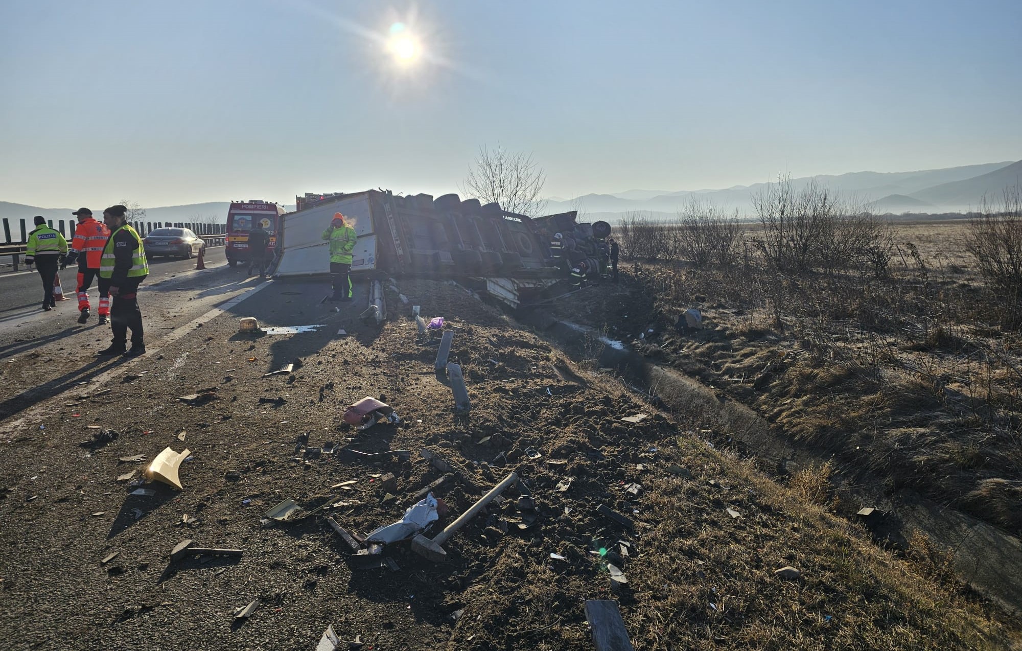 Autoutilitara de la drumuri era semnalizată cu girofare și numeroase indicatoare rutiere dar cu toate acestea nu a fost observată de șoferul tirului care, după ce a lovit mașina colegilor noștri s-a răsturnat în afara drumului.