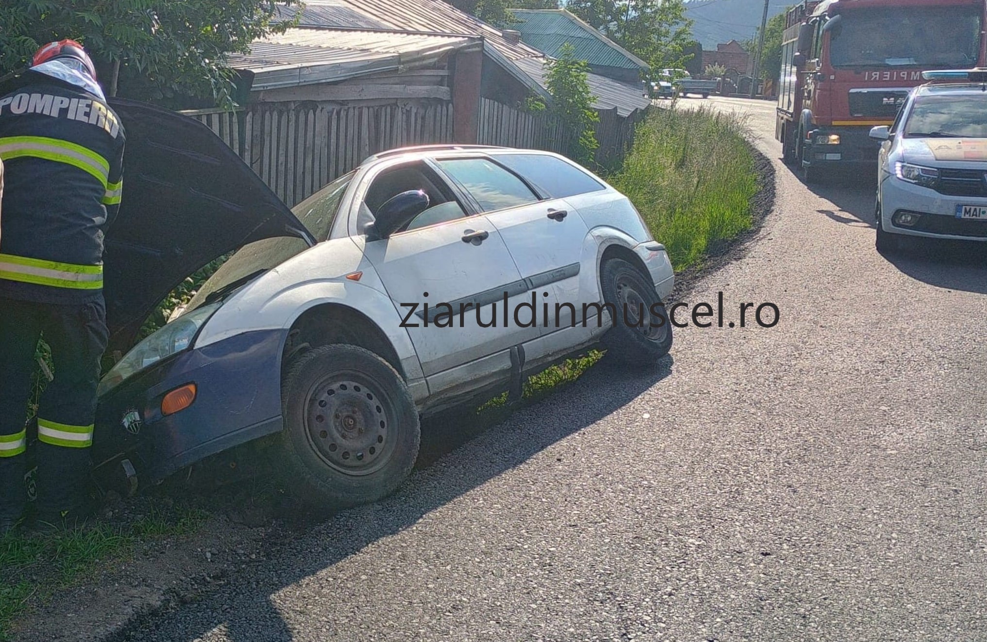 Accident rutier la ieșirea din Câmpulung Muscel. Mașină în șanț! Evenimentul rutier s-a produs pe strada Calea Brașovului, spre comuna Valea Mare Pravăț. În mașină au fost două persoane care sunt conștiente.