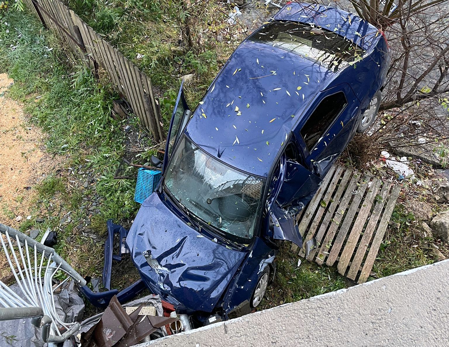 Este vorba despre un autoturism care a căzut de pe un pod. Mașina a ajuns jumătate într-o gospodărie, peste un un gard. A rupt balustrada podului pe traseu și un coteț pentru câine. Din fericire nu au fost oameni în curte. Oricum s-a auzit o bubuitură care a îngrozit pe toată lumea, zgomotul.