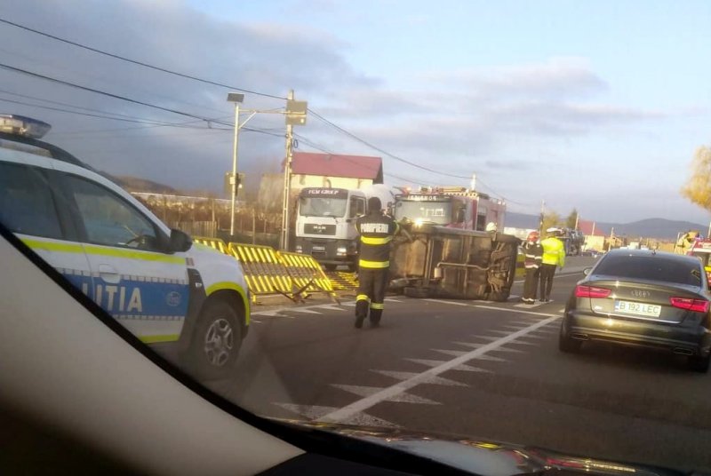 ACUM! Mașină răsturnată pe DN 73 Pitești- Câmpulung! La fața locului s-au deplasat pompierii cu o autospecială de intervenție cu modul de descarcerare și un echipaj SMURD.