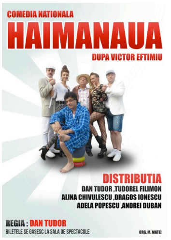 “Haimanaua”, adaptarea hollywoodiană şi plină de haz a lui Dan Tudor după “Omul care a văzut moartea” a lui Victor Eftimiu, vine la Mioveni. Piesa îi are în distribuţie pe Dan Tudor, Tudorel Filimon, Alina Chivulescu, Dragoş Ionescu, Adela Popescu şi Andrei Duban. Piesa va fi jucată pe scena Casei de Cultură a Sindicatelor Dacia, luni, 26 octombrie 2015, începând cu ora 19,00.