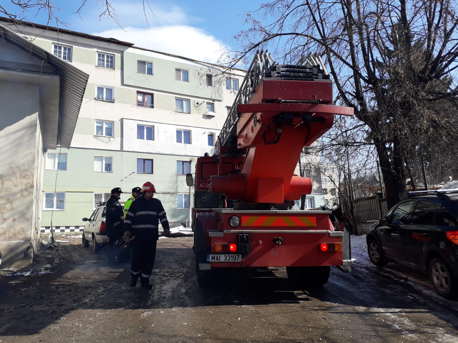 Altă nenorocire, după cea de azi noapte! Pompierii intervin în forță cu o scară și o autospecială.