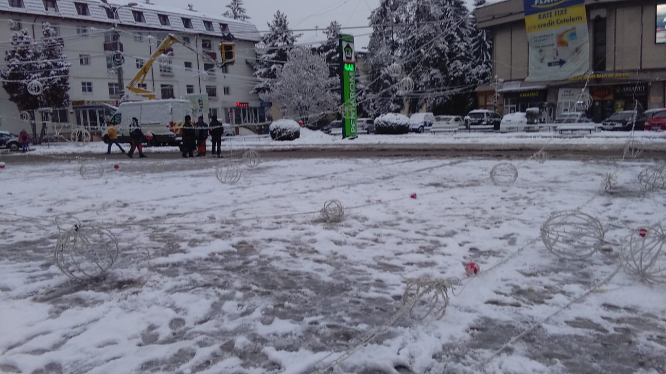 Omătul greu nu a doborât doar firele electrice pe carosabil, ci și ornamentele stradale astfel că s-a solicitat intervenţia angajaţilor de la Pet Electric, firmă care lucrează pentru instituția publică de mai mulți ani.