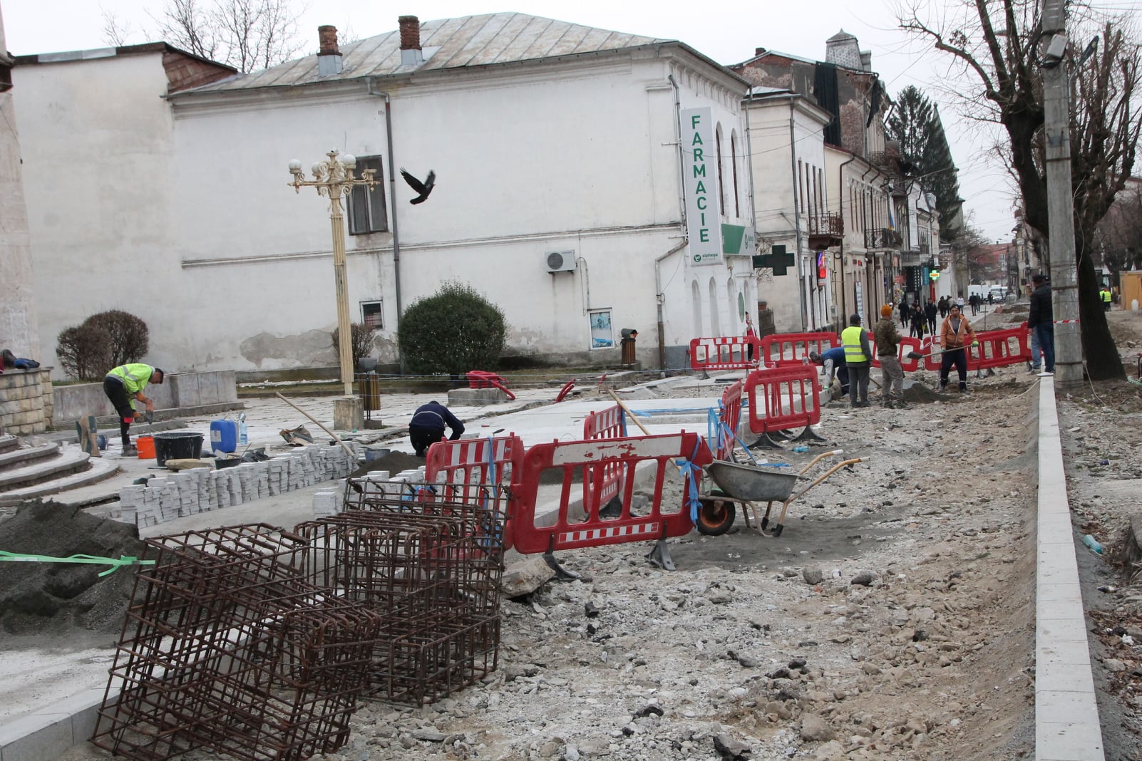 Lucrarea de amenajare a Bulevardului „Pardon”: după finalizarea trotuarului de pe strada Republicii, muncitorii au început pavarea celui de pe strada Negru Vodă.