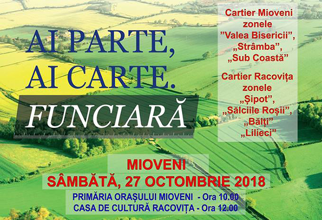 Până în anul 2023, terenurile din cartierele Mioveni și Racovița vor fi înregistrate gratuit în Sistemul Integrat de Cadastru și Carte Funciară, în cadrul Programul Național de Cadastru și Carte Funciară 2015-2023 (PNCCF).