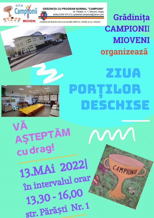 Vineri, 13 mai, în intervalul 13.30 – 16.00, conducerea unității de învățământ preșcolar organizează „Ziua Porților Deschise”, eveniment dedicat atât părinților ca mijloc de informare, totodată reprezentând și un mijloc de familiarizare al micuților cu atmosfera didactică în care urmează să pășească în curând.