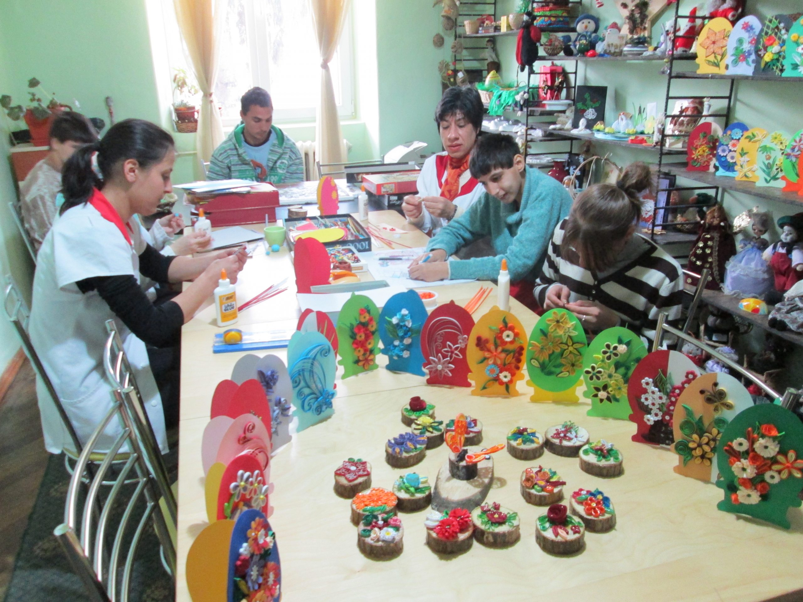 În fiecare an cu ocazia sărbătorilor Pascale în afară de curăţenie şi alte ocupaţii, pe grupe de vârste beneficiarii complexului pun în practică tot felul de tehnici din hârtie. Este o metodă foarte bună pentru ei, pentru calmare şi tratament, spun cadrele didactice ale complexului. În acest fel a luat fiinţă un atelier de creaţie, în cadrul complexului, unde copiii au sute de lucrări expuse, iar atunci când are loc vreun eveniment sau vreun invitat le calcă pragul, aceştia primesc de la beneficiarii complexului, tot felul de lucrări făcute din mâna lor. Sub îndrumarea atentă a educatorilor de la centrul de zi şi de la complexul rezidenţial au luat naştere tot felul de animale şi păsări din hârtie. De exemplu, pe holul complexului vizitatorii pot vedea Lebăda Blanca, construită cu migală din peste 3.000 de piese de hârtie identice, lucrare realizată de către beneficiarul, Cristi Soare.