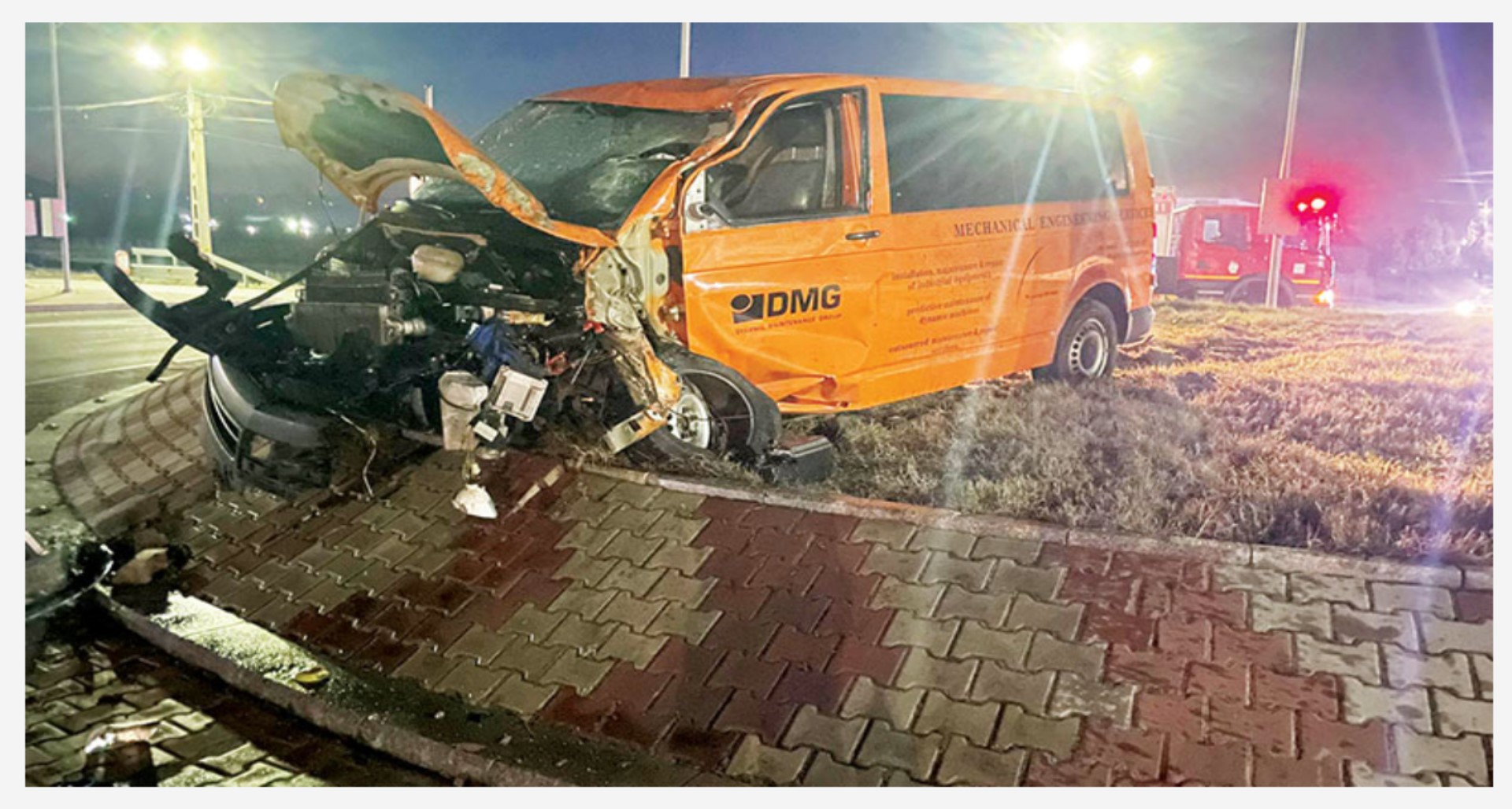 Apoi a fost proiectat într-o bordură pe care a sărit-o şi a intrat într-un stâlp de iluminat public. După care a fost aruncat în mijlocul sensului giratoriu.