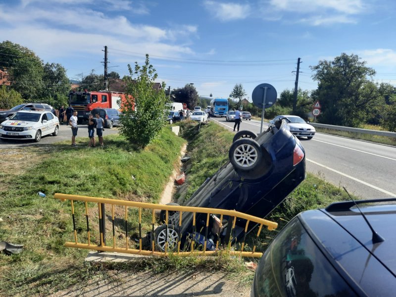 Cascadorie pe patru roți pe DN73, mai precis pe raza localității Mihăești. Un autoturism s-a răsturnat în afara carosabilului. Conducătorul auto a rămas blocat în autoturism.