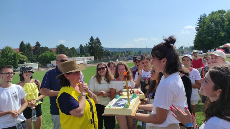 Carmen Bârloiu a și uitat de ziua ei de naștere, fiind foarte implicată în acest proiect. Dar cei 80 de tineri care au pus caiet lângă caiet pe o suprafață de peste 1000 de metri pătrați peste iarba stadionului, nu au uitat acest lucru. Prima dată au surprins-o cu un bughet de flori, după care a venit și tortul direct pe stadionul municipal Câmpulung.