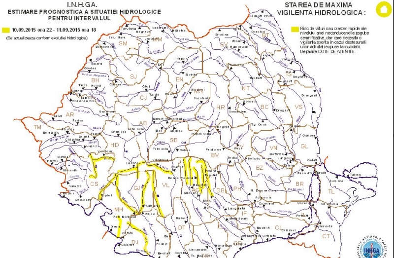 Institutul Naţional de Hidrologie și Gospodărire a Apelor a emis o avertizare hidrologică COD GALBEN, care vizează și râurile din județul Argeș. În intervalul 11.09.2015 ora 06:00 – 11.09.2015 ora 18:00 pe râurile din bazinul superior al Argeşului (judeţele Argeş şi Dâmboviţa), se pot produce scurgeri importante pe versanţi, torenţi şi pâraie, viituri rapide cu posibile efecte de inundaţii locale şi creşteri de debite şi niveluri cu posibile depăşiri ale cotelor de atenţie.
