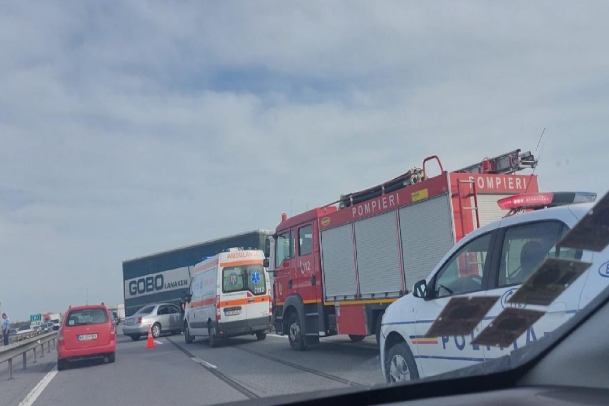„Autostrada A1, la km 82, pe sensul spre București, accident in care sunt implicate 4 autovehicule (3 autocamioane și o autoutilitară), din primele date 2 persoane au suferit leziuni.