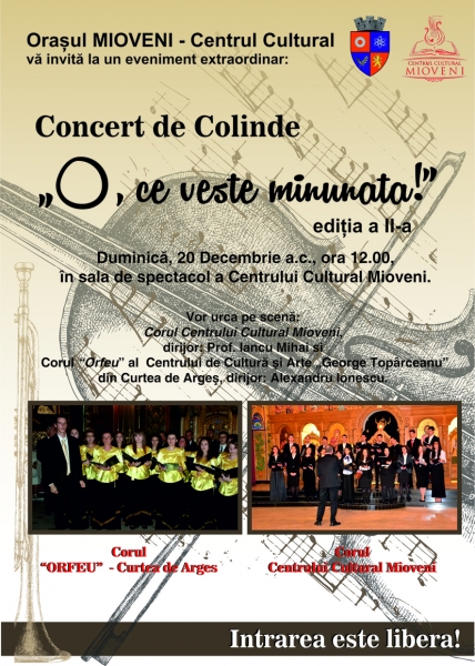 Concert de colinde la Mioveni! Colindele vor fi interpretate de Corul „Orfeu” şi Corul Centrului Cultural Mioveni!