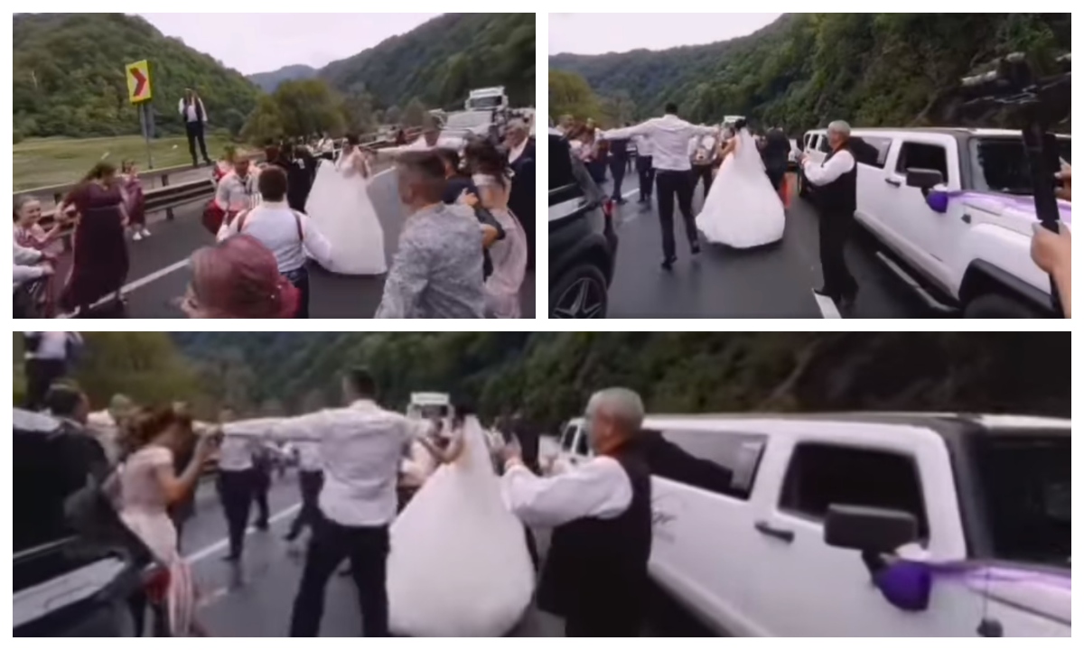 Cu mireasa în frunte au încins o sârbă printre mașini. Traficul a fost blocat din cauza aglomerației. Un cuplu de miri şi invitaţii lor au decis să nu mai piardă timpul şi să înceapă petrecerea de după cununia religioasă printre maşini pe Valea Oltului.