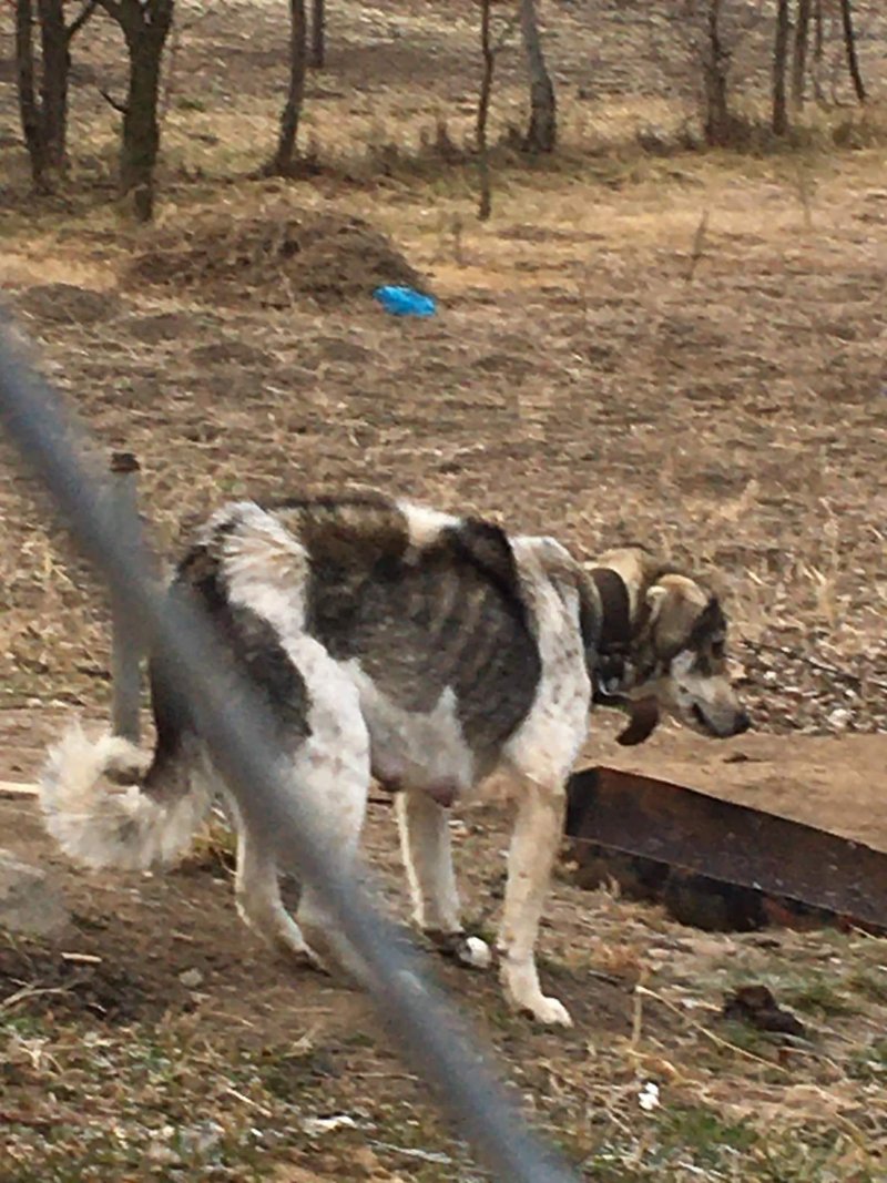 Căţeluşa, piele şi os, legată cu un lanţ de circa 1 metru, nu primeşte nici apă, iar puii, Dumnezeu ştie cum au ajuns la o lună.