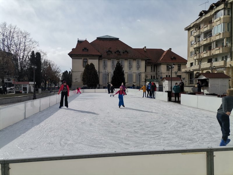 Distracție pe ultima sută de metri! Luni este ultima zi când pationoarul mai stă în piața primăriei Câmpulung. Din fericire pentru copii, adulți dar și pentru cei mari vremea a ținut cu ei pentru a se bucura de gheață și patine.