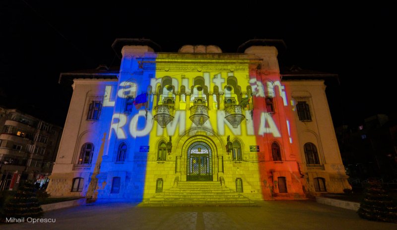 Două clădiri din Câmpulung înveșmântate în tricolor! Clădirile Primăriei și ale Bibliotecii „Ion Barbu” au căpătat culoare după ce a fost proiectat pe ele tricolorul și un text ,,La mulți ani România”.