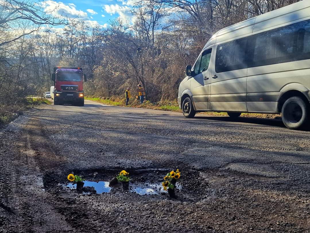Firavele flori au fost puse în craterele care, rup roțile mașinilor care trec prin zonă.