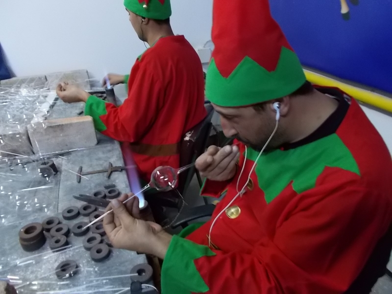 Spiriduşii Moşului modelează rapid la temperaturi de peste 1000 de grade Celsius, sticla din care ies tuburile, baghetele. Apoi mintea şi mâinile pricepute îi fac pe spiriduşi să dea viaţă globuleţelor sub diferite forme. În atelierul lor au prins viaţă, de-a lungul anilor, mii de obiecte decorative din sticlă. Atelierul spiriduşilor reprezintă pentru cei care îi vizitează este o lume aparte. Lucrează cu drag, pun suflet în ceea ce fac, iar din mâinile lor pricepute ies adevărate comori care îţi încântă ochii şi te fac să te întrebi cum a fost posibilă realizarea lor. Globuleţele realizate de spiriduşi trec apoi prin lacuri şi vopseluri unde câteva perechi de mâini îndemânatice scriu mesaje scurte, la comandă. Copiii care ajung să vadă cum fac spiriduşii globuleţe rămân muţi de uimire şi numai vor să plece din fabrică.