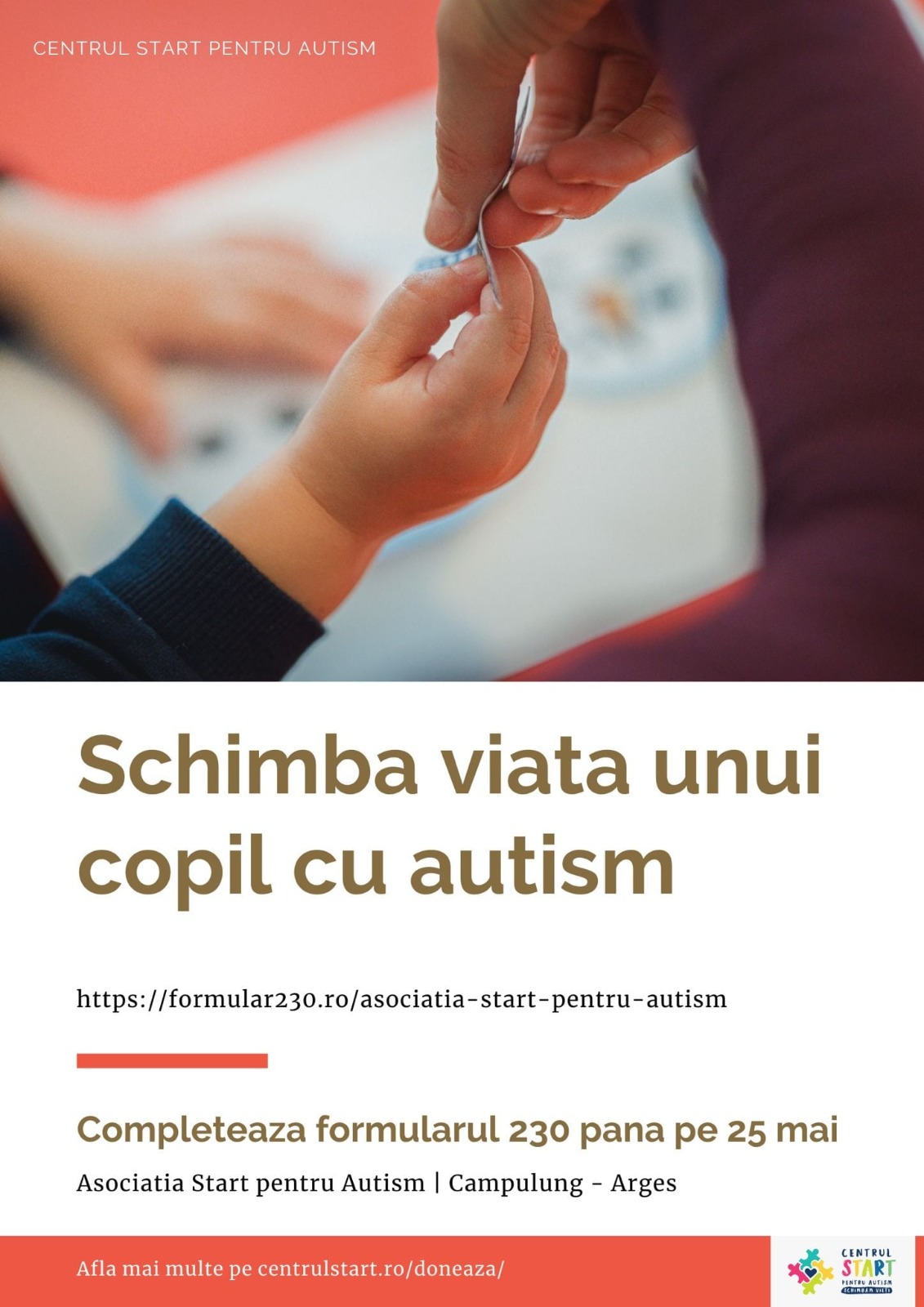 Haideți cu toții să ajutăm copiii cu autism din zona Câmpulungului. Este foarte simplu. Trebuie doar să redirecționăm 3,5% GRATUIT din impozitul nostru către Asociația Start pentru Autism.