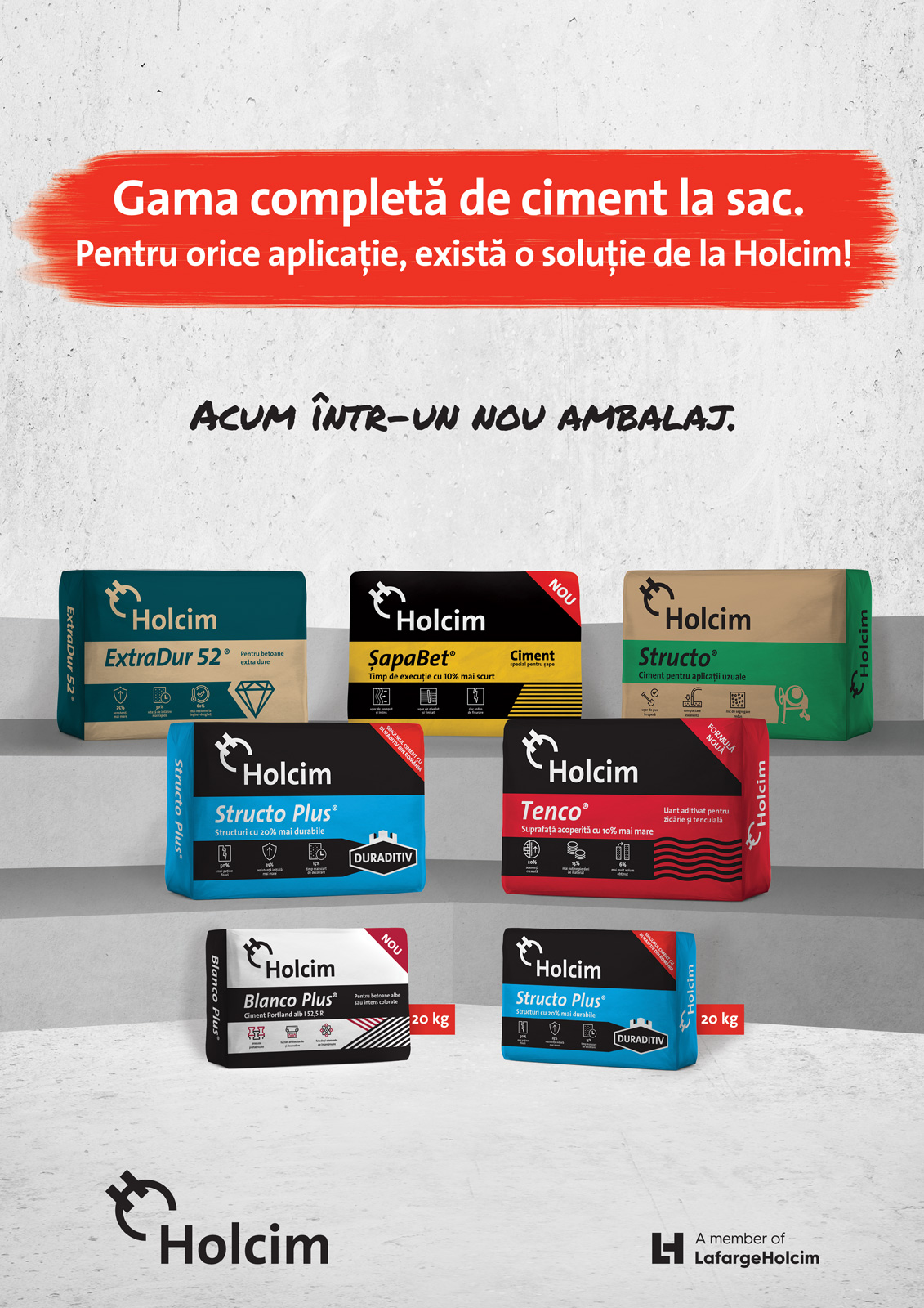 Holcim România lansează gama completă de ciment la sac, ce include mărcile Structo Plus, Blanco Plus, ȘapaBet, Structo, ExtraDur 52, Tenco.