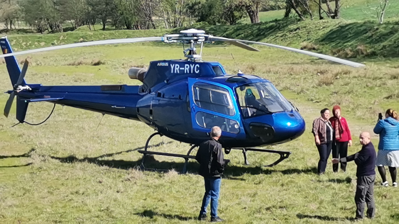 Imaginea zilei vine din Muscel. La mânăstire cu elicopterul. A devenit atracția evenimentului. Cei prezenți la punerea pietrei de temelie la Athosul Argeșului au dat o fugă să filmeze elicopterul din iarbă.