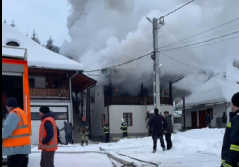 Conform pompierilor, incendiul se manifestă la interiorul acoperișului, cu degajări mari de fum.