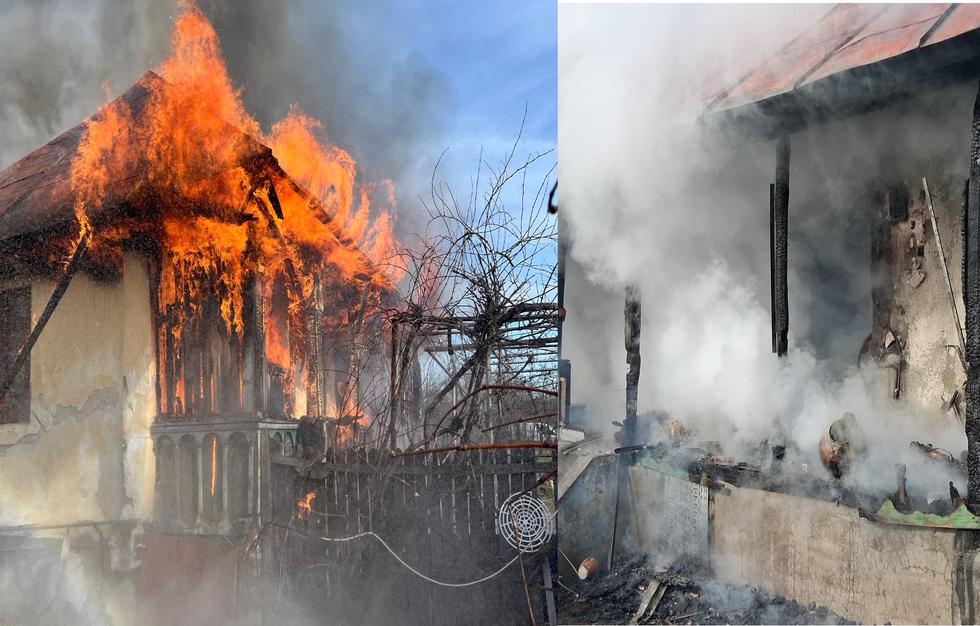 Incendiu puternic la o casă bătrânească. Butelie evacuată din interiorul locuinței. Pericol de explozie.