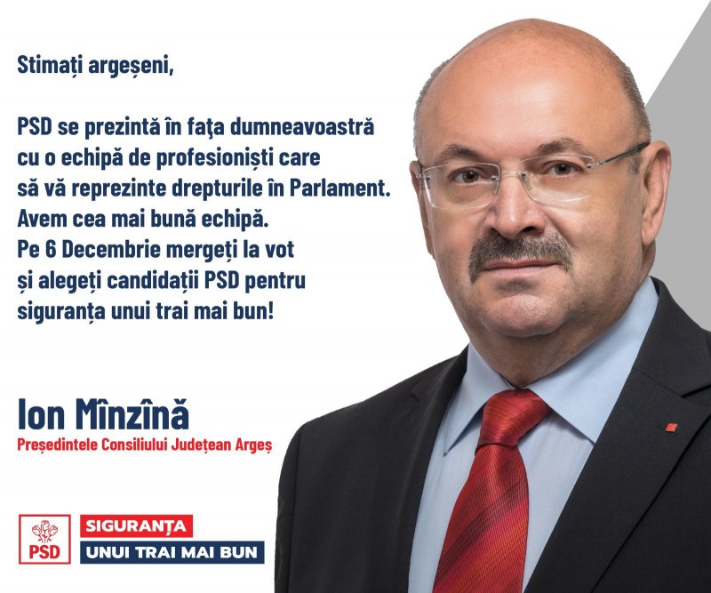 Avem în Argeș cea mai bună echipă de candidați pentru Senat și Camera Deputaților care vor lupta în Parlament pentru Argeș. Pe 6 decembrie mergeți la vot, stimați argeșeni, și alegeți candidații PSD pentru siguranța unui trai mai bun!”, este mesajul pe care Ion Mînzînă îl transmite argeșenilor.