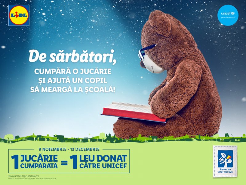 Clienții Lidl pot contribui la susținerea elevilor cu risc de abandon, pentru ca ei să își finalizeze studiile, să fie pregătiți pentru piața muncii și astfel să stopeze perpetuarea sărăciei din generație în generație. Pentru orice produs achiziționat din gama de jucării, până pe 13 decembrie, Lidl va direcționa 1 leu către UNICEF.