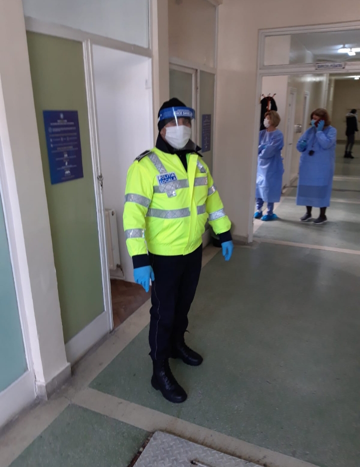 Poliţiştii locali asigură buna desfășurare, ordinea si linistea publica, fluidizarea traficului rutier zona parcării, şi respectarea accesului intrare- iesire zona de vaccinare a persoanelor venite la vaccinare conform planificării.
