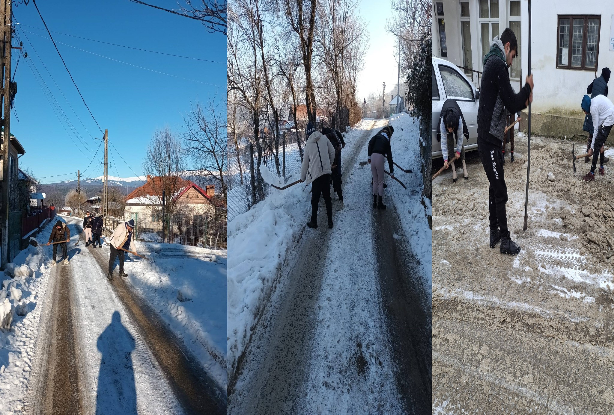 Localitatea Bughea de Jos, model de deszăpezire la lopată și măturoaie beneficiarii de ajutoare sociale.