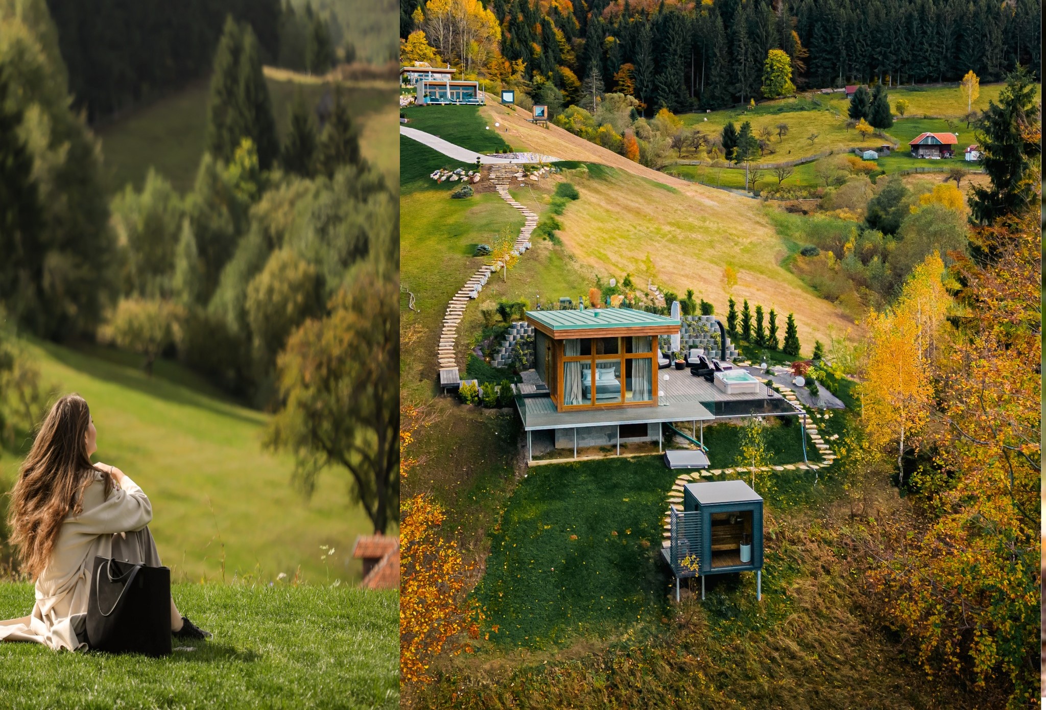 Proprietatea se întinde pe mai mult de 3 hectare și este compusă din trei vile minimaliste din lemn scandinav, proiectate pentru intimitate absolută. Locația este destinată exclusiv adulților. Oaspeții au acces la saună și jacuzzi inclus în tariful de cazare. Fațadele vitrate oferă priveliști directe către pădurea de conifere și peisajul montan, creând un cadru ideal pentru reconectarea cu natura și cu sine.