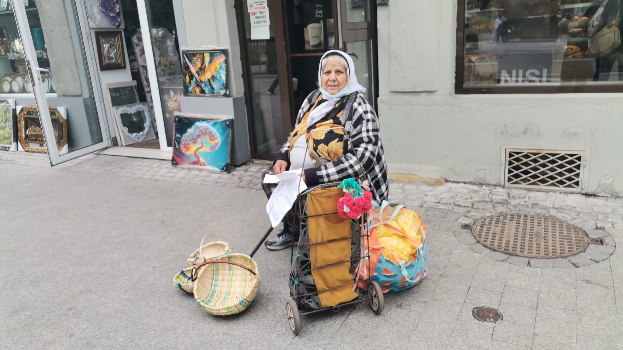 Bătrâna, are expuse câteva corfe, coșuri din paie, pe care spune că vrea să le vândă cu sume cuprinse între 20 de lei cel mic și 60 cel mai mare. Femeia are și o poveste care să impresioneze trecătorii.