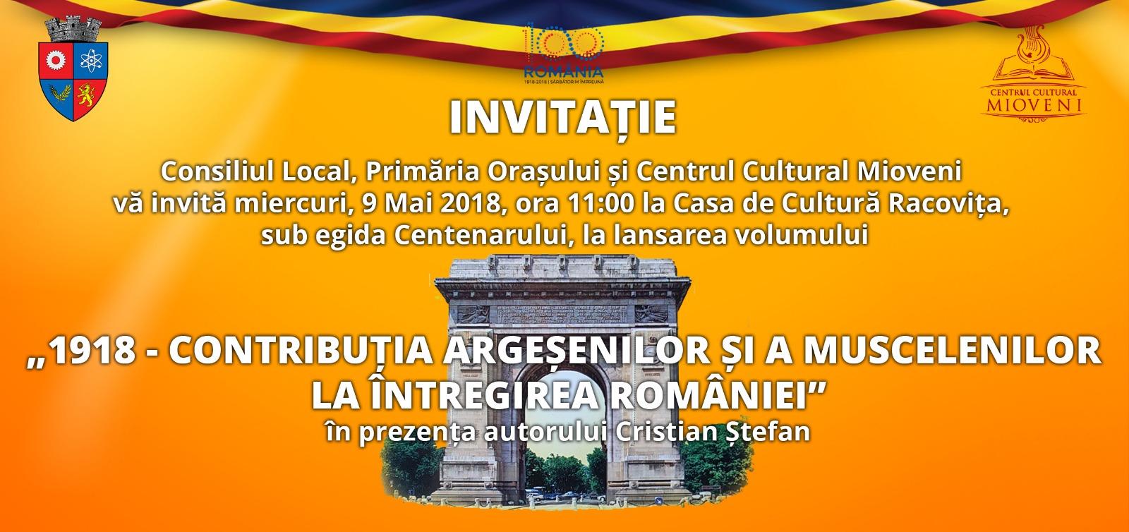 Sub egida Centenarului Marii Uniri, miercuri, 9 mai, de la ora 11.00, la Casa de  Cultură Racovița din Mioveni, va avea loc lansarea carții „1918 – CONTRIBUȚIA ARGEȘENILOR ȘI A MUSCELENILOR LA ÎNTREGIREA ROMÂNIEI „,  semnată de profesorul Cristian Ștefan.