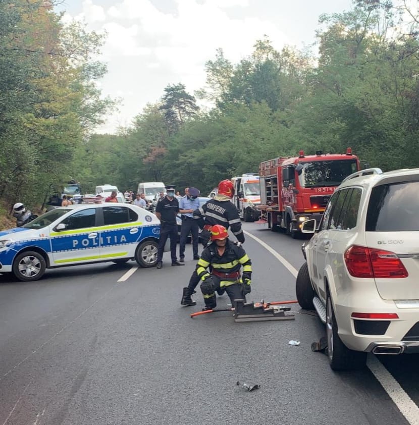 La fața locului sunt pompierii cu o autospecială de intervenție și o autospecială de descarcerare, plus un echipaj SAJ cu o ambulanță.