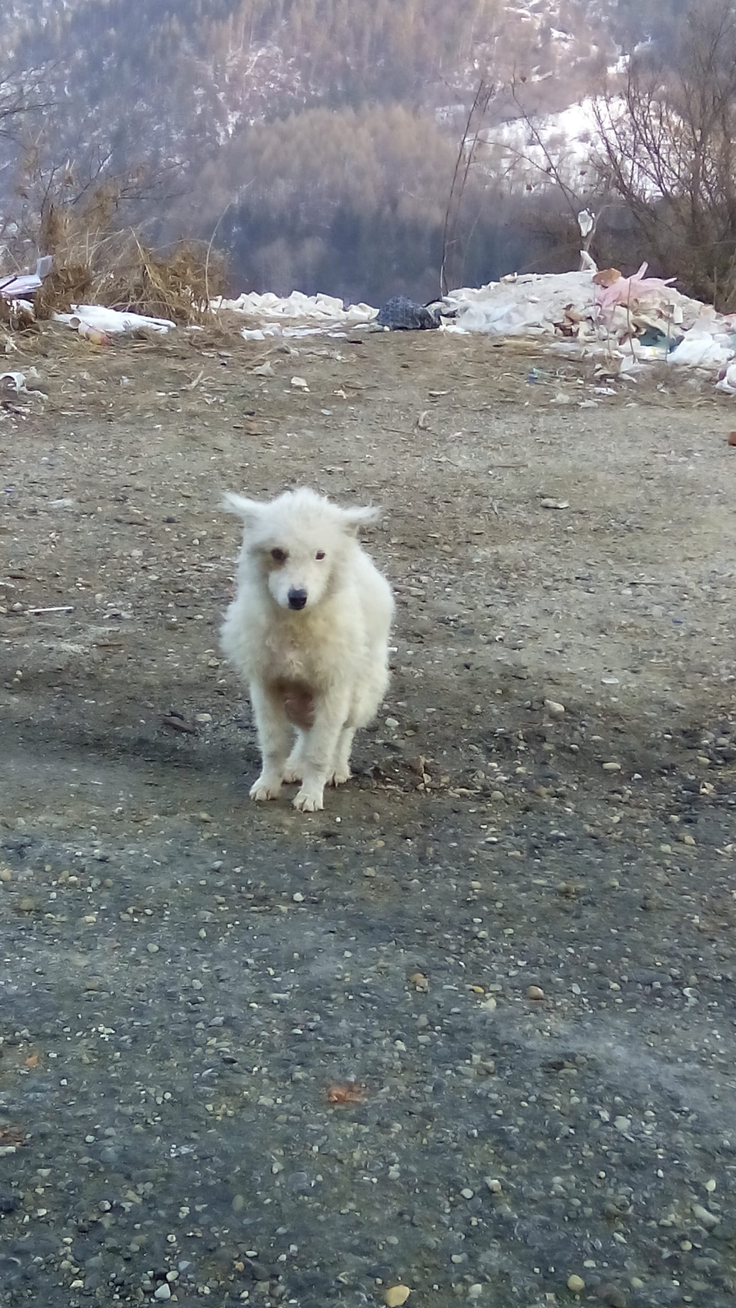Pe DN 73, pe Mateias, de circa doi ani, hrănesc o căţeluşă. Este de talie mijlocie, are părul ca al unui bichon. O căţeluşă care se teme de oameni, iar dacă primeşte mâncare aşteaptă ca omul să plece, apoi se apropie. În urmă cu doi ani avea doi pui pufoşi, nu i-am mai văzut la scurt timp după ce i-am hrănit, probabil nu au supravieţuit. Am decis să nu o mai hrănesc pe Mateiaş, să o ajut să ajungă la adăpost, să poată să trăiască zilele pe care le mai are, undeva unde are mâncare şi iubire. Sprijinită de prietenii de la Asociaţia ANIMA, am plecat după căţeluşă. Am reuşit să o prindem, iar acum, feţiţa se află la adăpost.