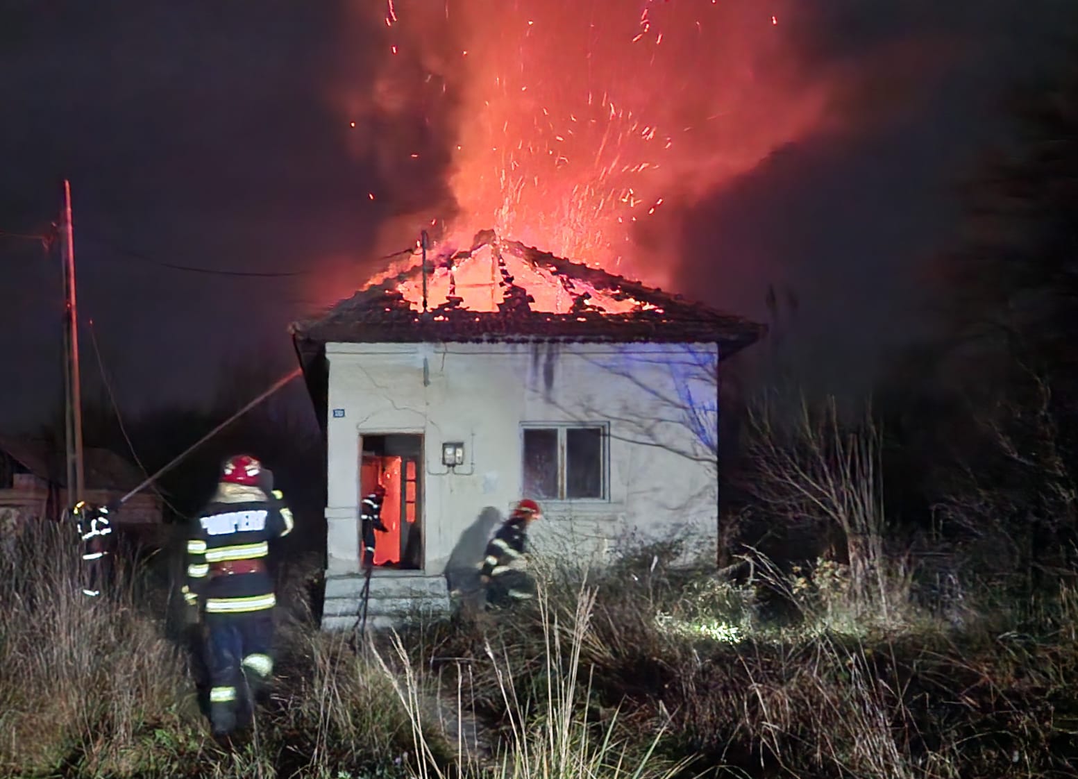 La fața locului s-au deplasat trei echipaje cu două autospeciale de stingere ale incendiilor și o ambulanță SMURD, care au acționat pentru lichidarea flăcărilor ce au cuprins acoperișul casei de aproximativ 100 mp.