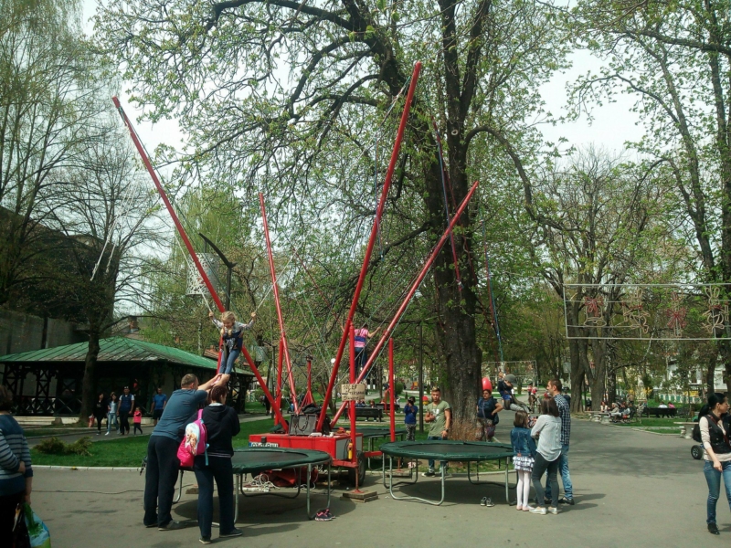 Din peisaj nu lipseşte nici toboganul gonflabil, nici trambulinele „Bungee”. 10 lei de persoană costă 5 minute de sărituri la trambulină.