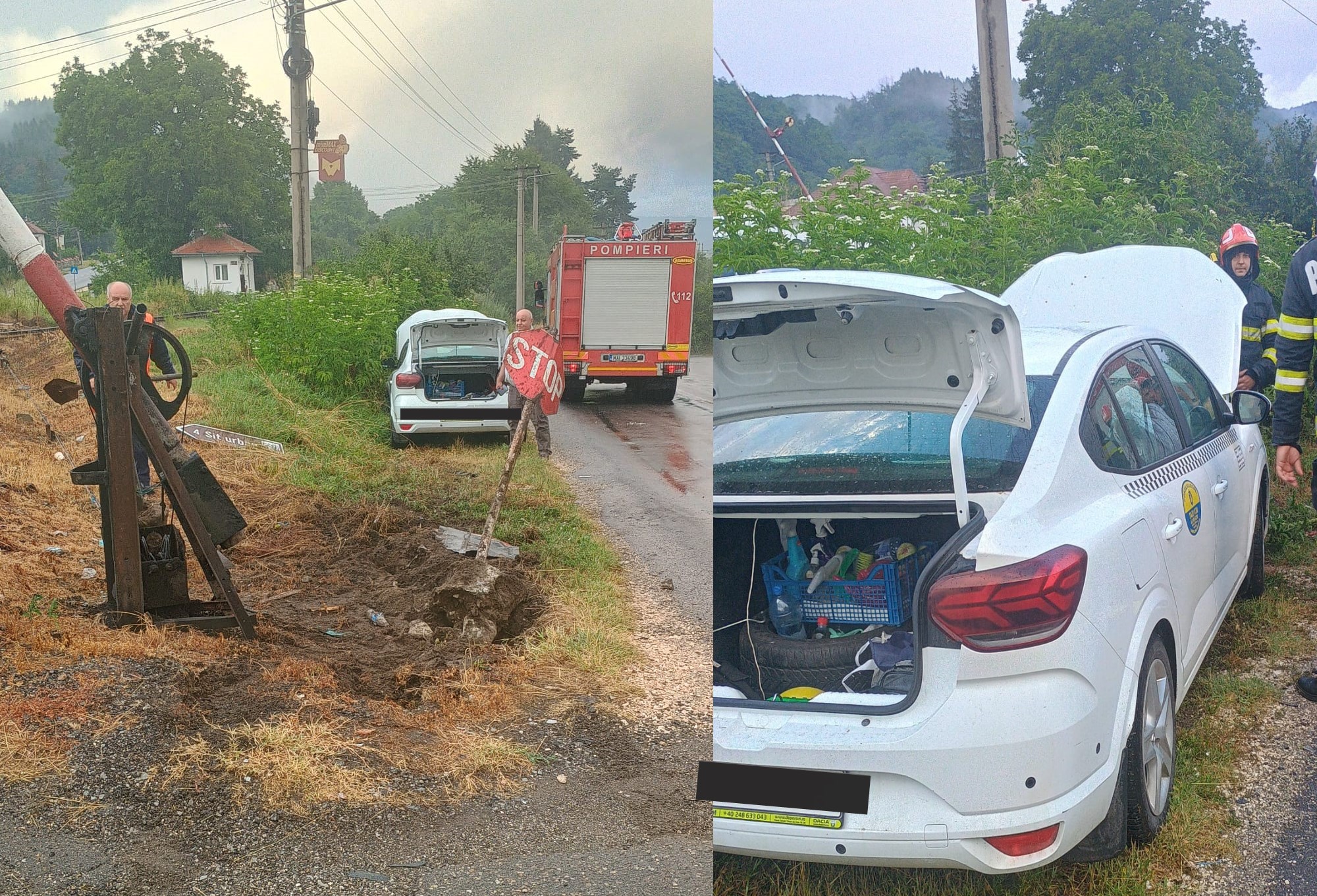 Pericol public la intrarea în Câmpulung Muscel. A distrus indicatoarele rutiere de frica trenului! Un eveniment rutier neobișnuit a avut loc la intrarea în oraș, pe strada Apa Sărată. Un șofer conducător de Dacia Logan care practică taximetria cu mașina inscripționată s-a grăbit să fenteze bariera de la trecerea de cale ferată și de frica trenului a ieșit cu mașina în decor.