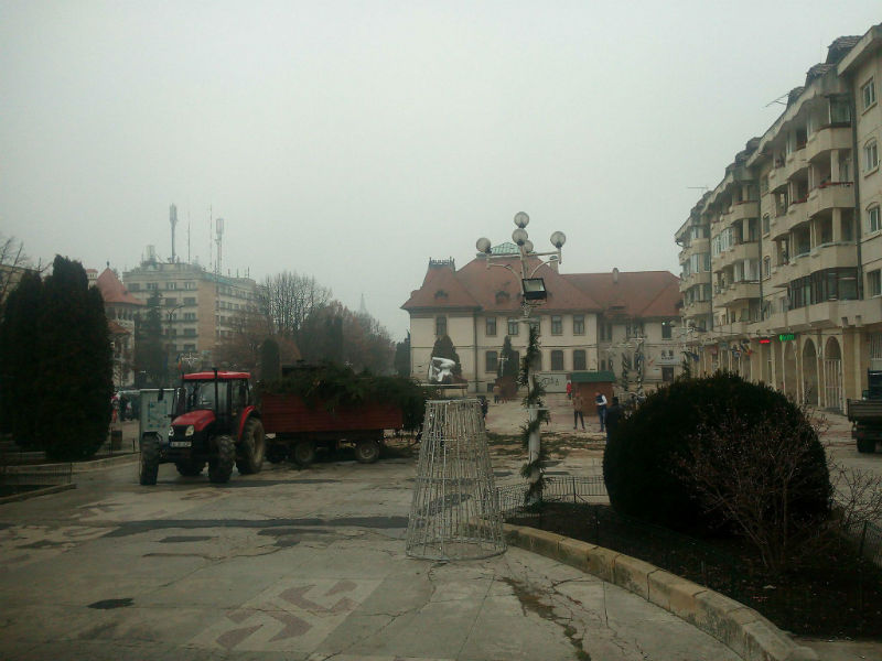 Pomul de Crăciun din piaţa primăriei a fost demontat. De dimineață, angajații de la o firmă ce a câştigat contractul pentru intervenţie au scos luminițele iar angajații de la spații verzi l-au demontat.