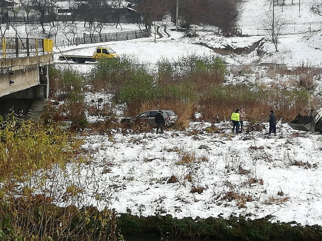 Se pare că, persoana aflată la volanul autoturismului, a intrat mai tare în curbă şi nu a mai putut controla maşina în zona podului unde se făcuse o pojghiţă de gheaţă. Greşeala l-a costat, astfel că omul a zburat pur şi simplu de pe pod în albia râului.