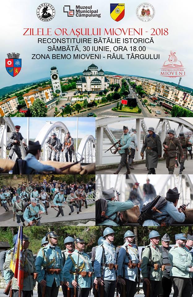 Focuri de armă, explozii și impresionante efecte pirotehnice, puști, pistoale, mortiere, tunuri, muniție, zeci de militari români și străini, tabără militară, tranșee, război! Atac, contraatac, ambuscadă, retragere, armistițiu, schimb de prizonieri, capitulare. Cine va învinge și cum se va desfășura bătălia? Ți-am stârnit interesul? Ești curios să vezi pe viu o scenă autentică de război? Timp de două zile, Mioveniul va fi sub asediul “armatelor inamice”, totul petrecându-se în cadrul unei manifestări istorico-militare de reconstituire istorică, un inedit proiect dedicat Centenarului Marii Uniri – 100 de ani de la primul Război Mondial.