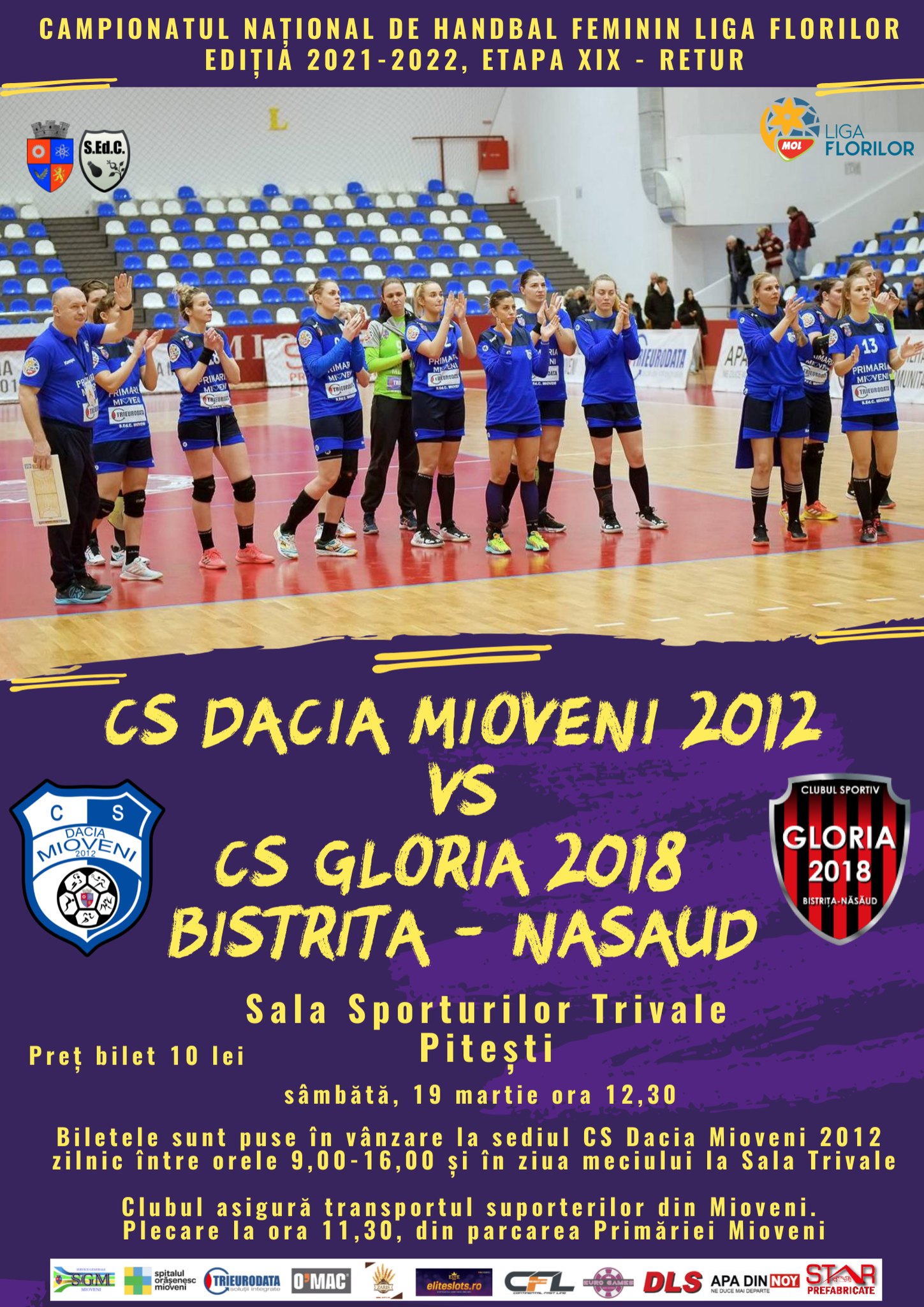 Meciul etapei XIX din Liga Florilor, Dacia Mioveni – Gloria 2018 Bistrița – Năsăud se va juca sâmbătă, de la ora 12.30, la Sala Sporturilor Trivale din Pitești!