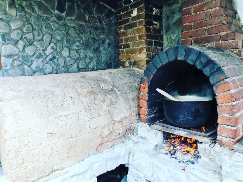 Doamna Luiza de la Podu Dâmboviței pe lângă faptul că ne-a așteptat cu multe bucate tradiționale din lapte și carne specifice zonei Muscel, ne-a gătit mămăliga locului căreia i se spune broască.