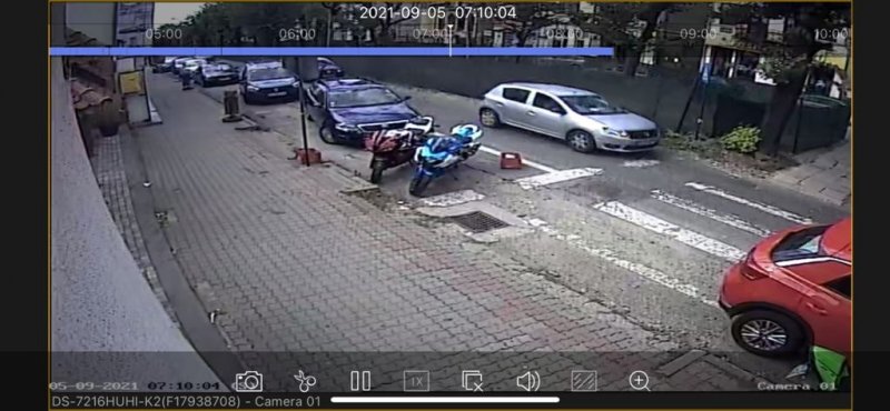 Camerele de supraveghere amplasate în zonă au surprins toată acțiunea bărbatului, cum a oprit mașina în trafic, cum s-a dat jos și a furat casca de pe motocicletă.