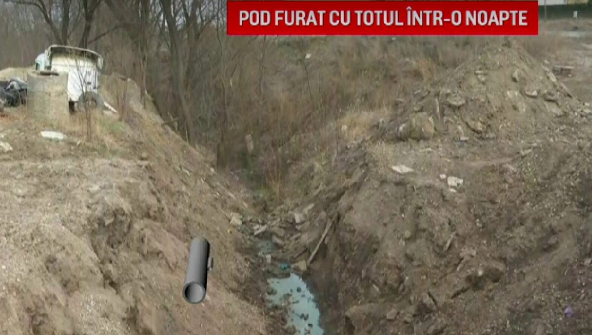 Hoții au furat tuburile de beton de 15 tone, care formau podul rutier. Nu este singurul furt neobișnuit, anchetat în aceste zile. În Bacău, patru stâlpi de înaltă tensiune s-au prăbușit, după ce mai mulți indivizi au furat barele metalice de la baza lor.