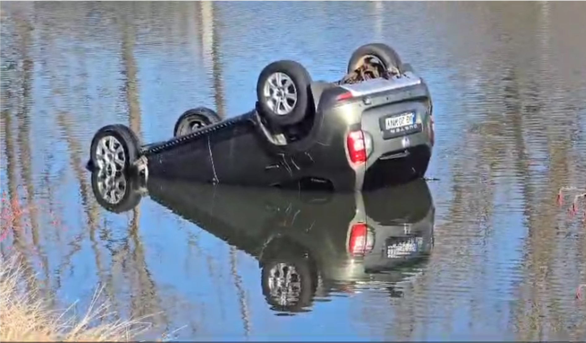 Mașină cu roțile în sus în Barajul Budeasa. Un șofer teribilist a ajuns într-un canal de deversare.